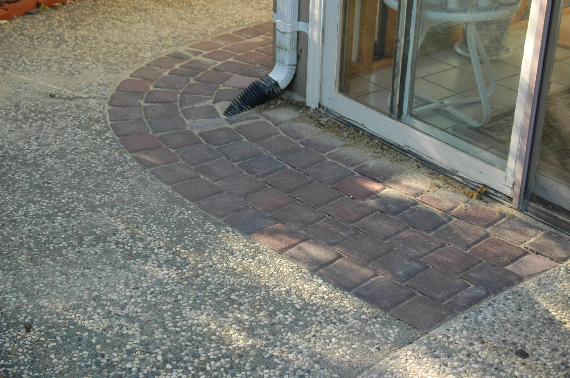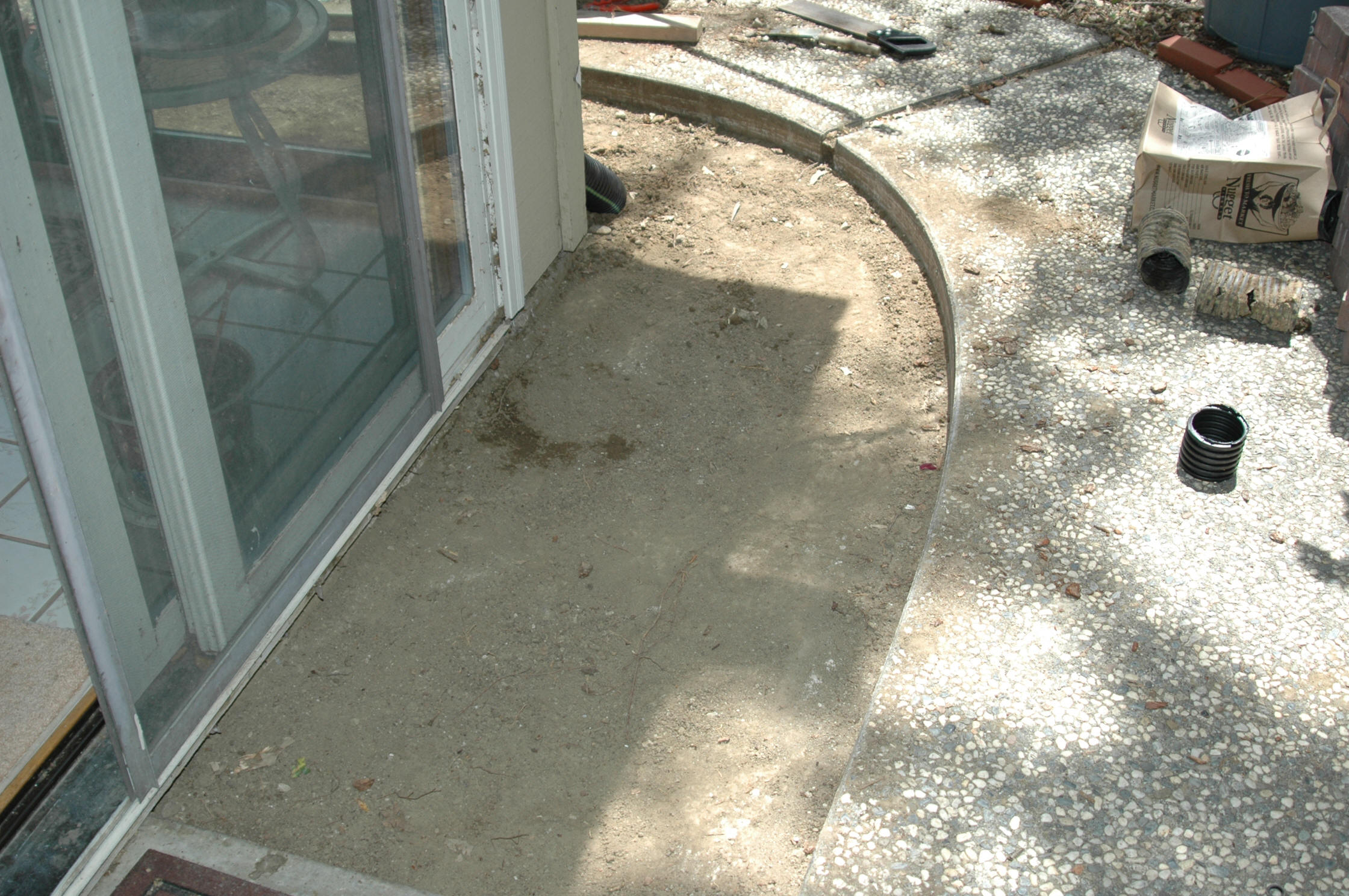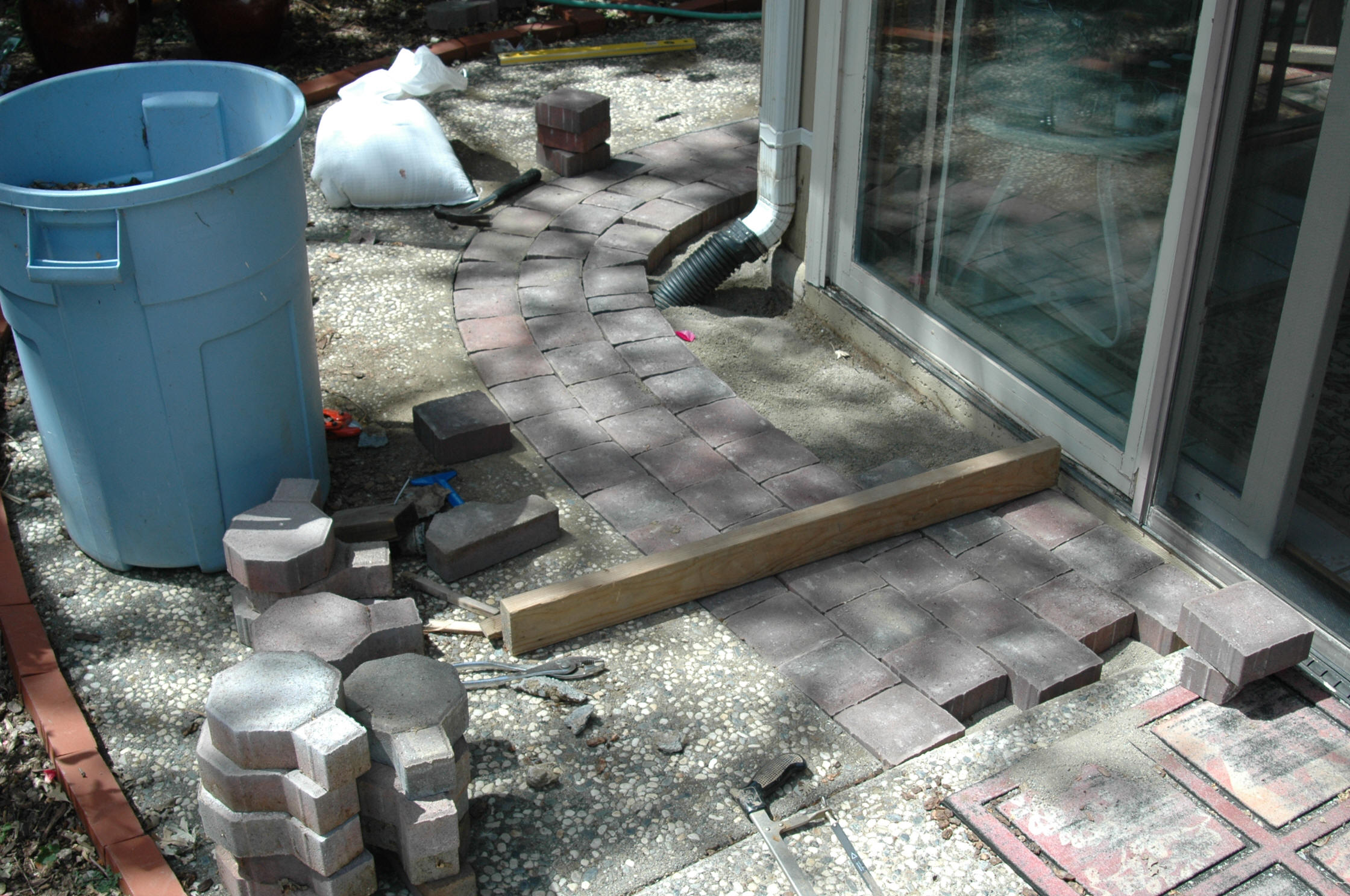 | I used the 2x4 as a guide for level and to slope the pavers slightly away from the house for drainage. I didn't use those fancy bricks. Those were from another project. I was just trying them out in this area. Their odd shape would have made them to difficult to use. | The finished product. The rocks up by the sliding door are kind of muddied. They should look better when the dry. |