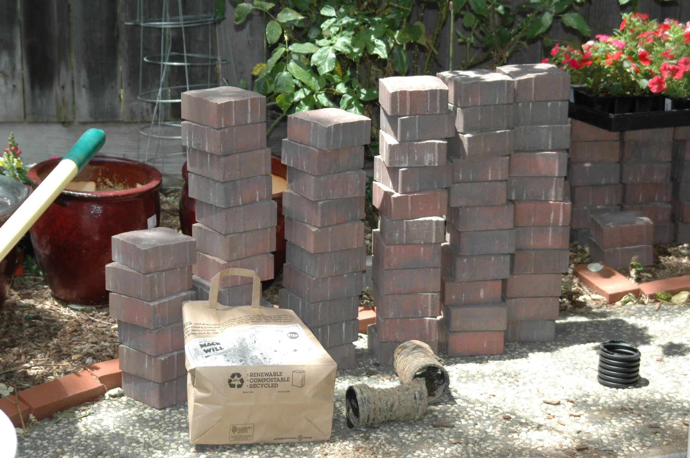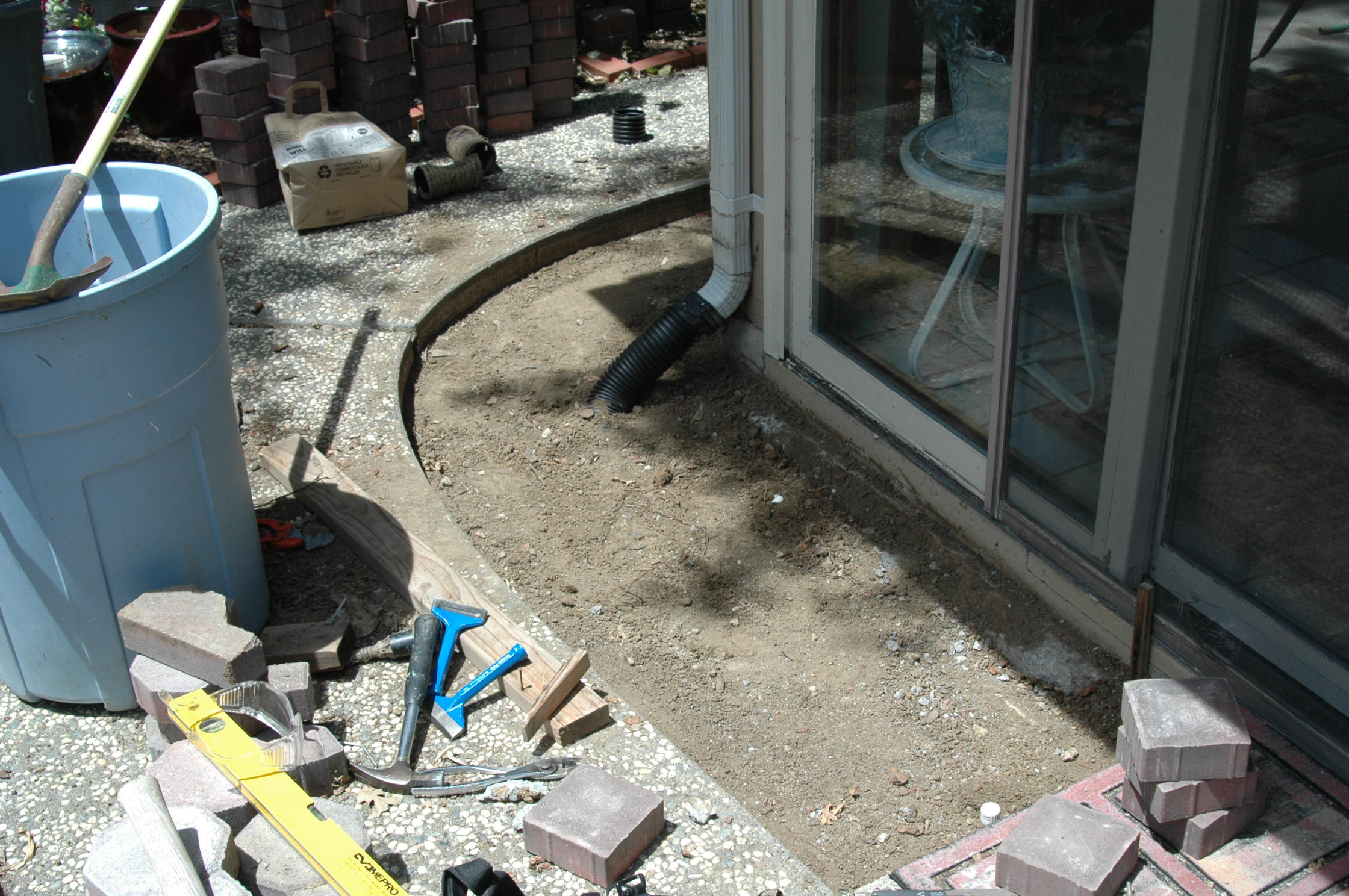 | This area had some plants that never really grew well and there was redwood bark as a ground cover. It looked like crap so we decided to take it all out and put in the concrete pavers. | I dug all the old stuff out and leveled the dirt as much as I could to get started. The black pipe carries water from the back roof out to the front yard since my property slopes toward the house. |
