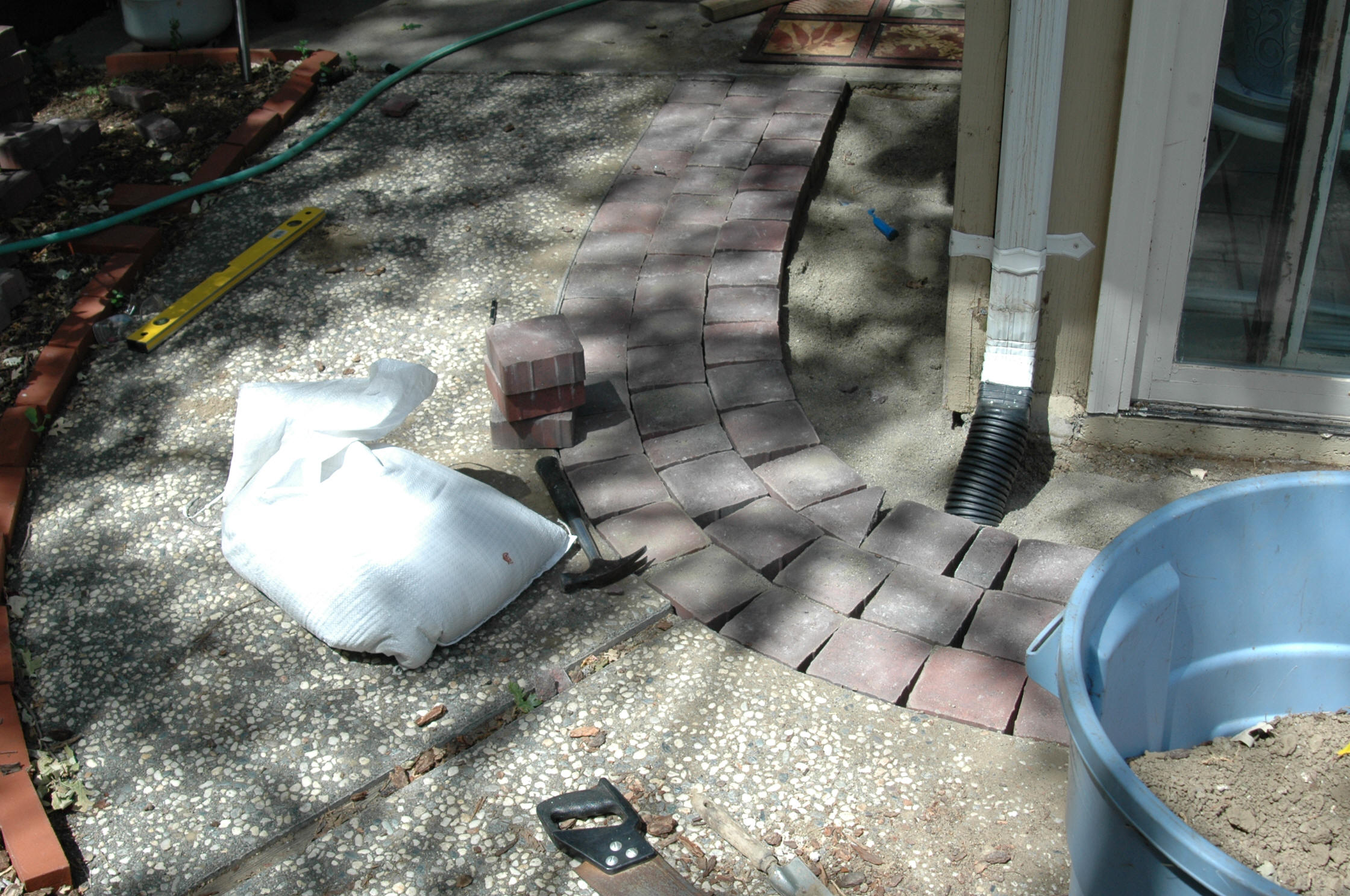 | In my zeal I cut the aforementioned corrugated pipe and had to splice in a new section. The pavers were staged to be laid. | A bed of sand is put down as a base for the pavers. That blue chisel is used to cut the pavers if necessary. |