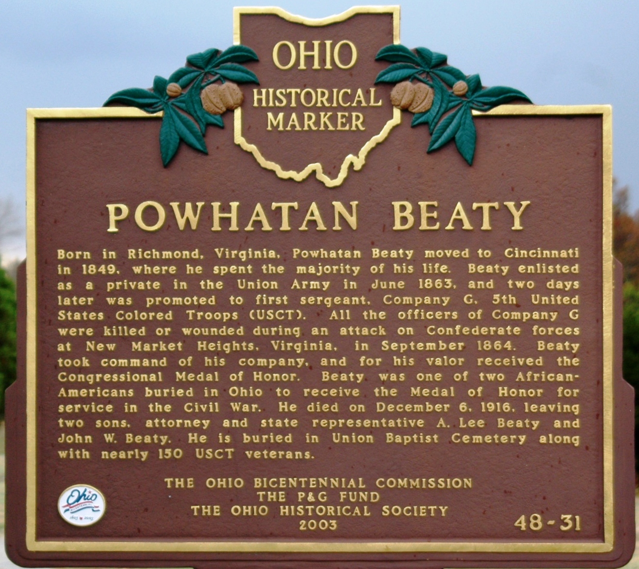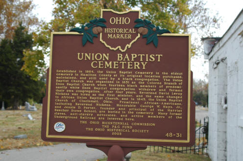 | The marker here and the one to the right are on opposite sides of each other on the road leading to the back of the cemetery. Union Baptist Established in 1864, the Union Baptist Cemetery is the oldest cemetery in Hamilton County at its original location purchased, maintained, and still used by a black congregation. The Union Baptist Church was organized in 1831 as the Colored Branch of the Enon Baptist Church when fourteen black members of predominantly white Enon Baptist congregation withdrew and formed their own congregation. After four years, Reverend David Leroy Nickens was hired as the first minister and the name changed to African Union Baptist Church, and in 1845, the Union Baptist Church of Cincinnati, Ohio. Prominent African –Americans including Reverend Nickens, Honorable George W Hays, Jr., and Jennie D. Porter, founder and principal of the Harriet Beecher Stowe School, are buried in the cemetery. Many former slaves, anti-slavery advocates, and active members of the Underground Railroad are interred here. The Ohio Bicentennial Commission 48-31 | The marker here and on the left are on opposite sides of each other on the road leading to the back of the cemetery. Powhatan Beaty Born in Richmond, Virginia, Powhatan Beaty moved to Cincinnati in 1849, where he spent the majority of his life. Beaty enlisted as a private in the Union Army in June 1863 and two days later was promoted to first sergeant, Company C 5th United States Colored Troops (USCT). All the officers of Company C were killed or wounded during an attack on Confederate forces in New Market Heights, Virginia in September 1864. Beaty took command of his company , and for his valor received the Congressional Medal of Honor. Beaty was one of two African Americans buried in Ohio to receive the Medal of Honor for service in the Civil War. He died on December 6, 1916 ,leaving two sons, attorney and state representative A. Lee Beaty and John W. Beaty. He is buried in Union Baptist Cemetery along with nearly 150 USCT veterans.