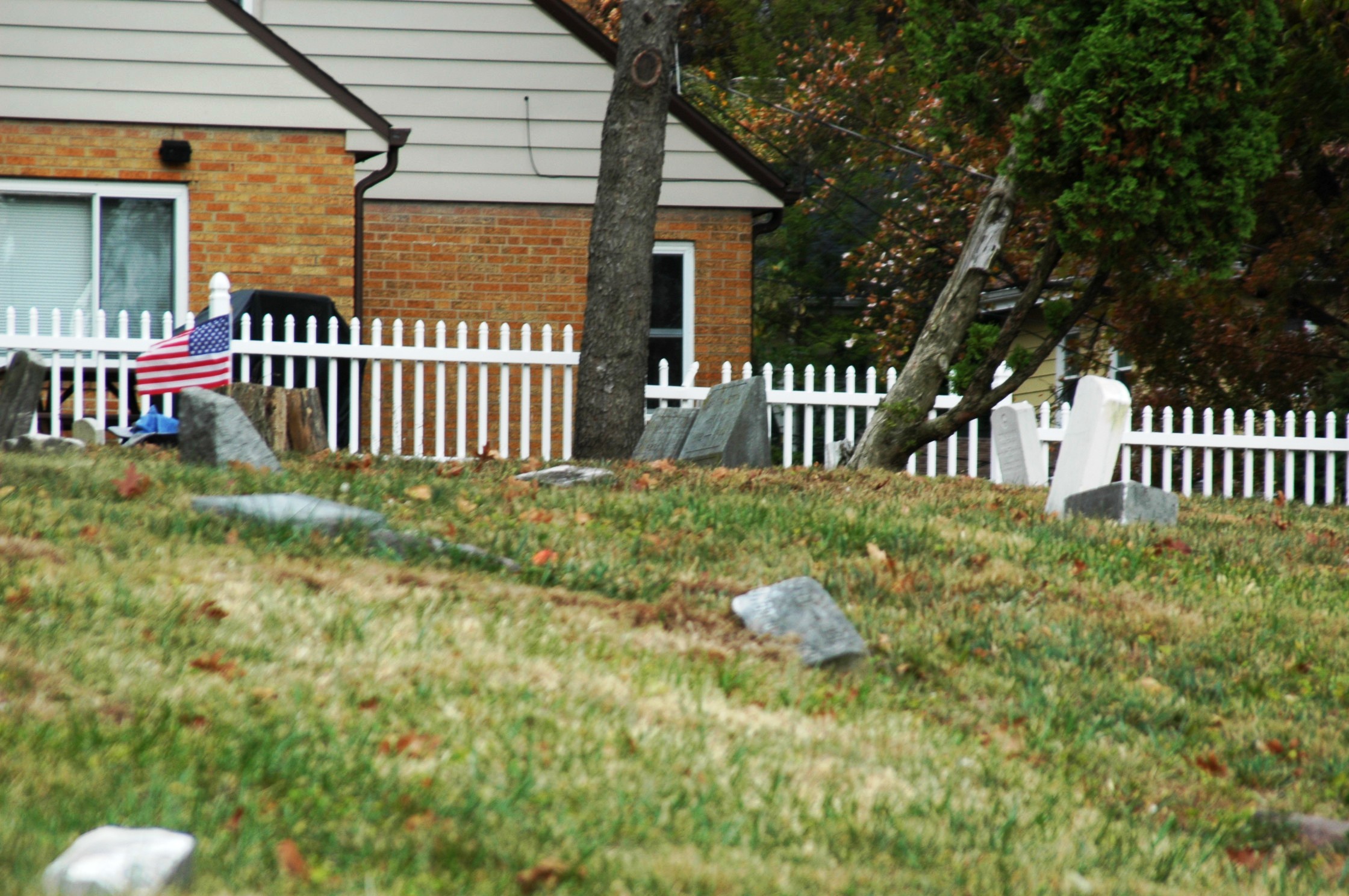 | The two graves are located between the flag and the two headstones between the trees. | This is the same shot as the picture on the left with the telephoto lens at minimum. The slope is a little more evident here. |