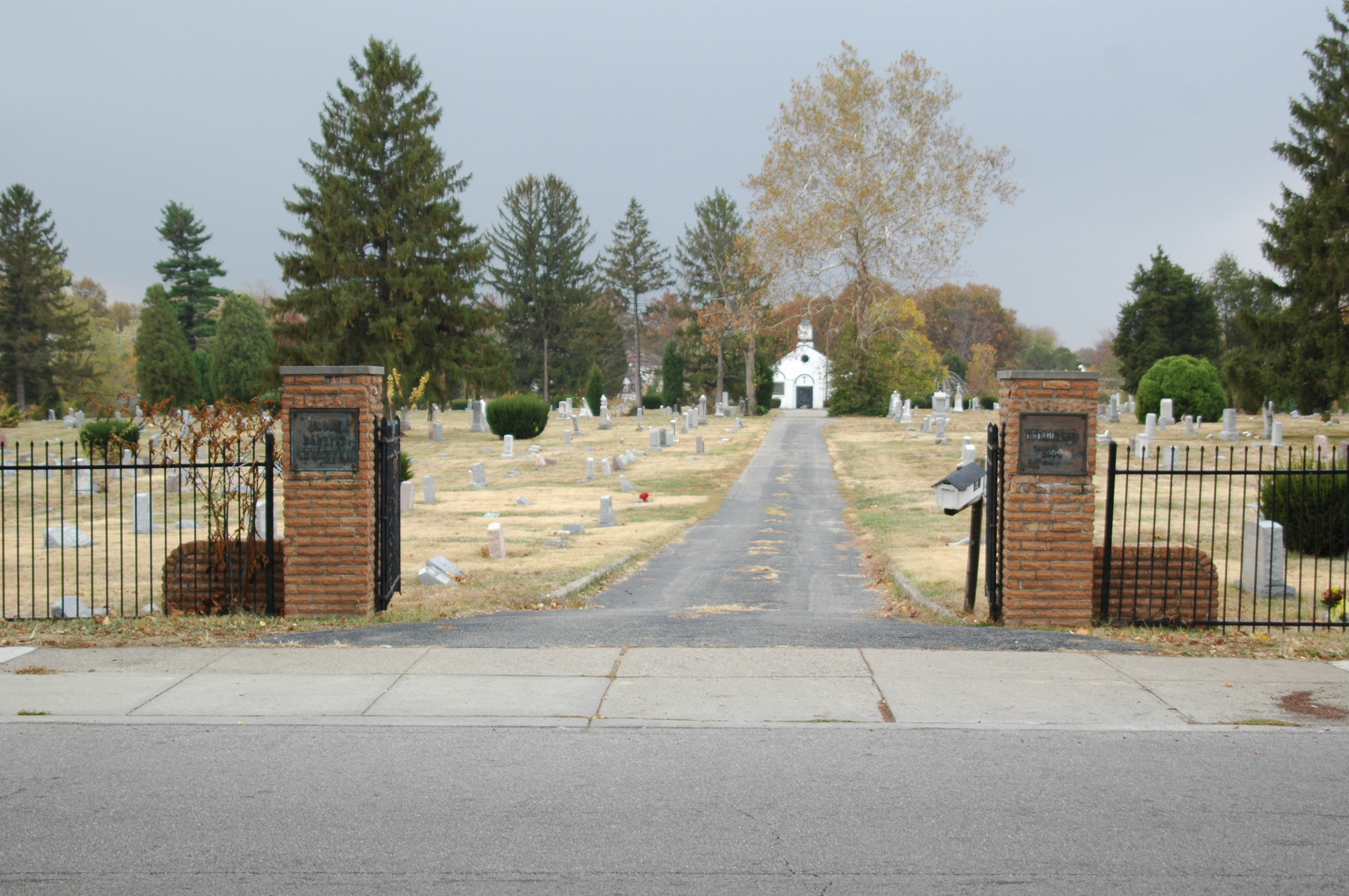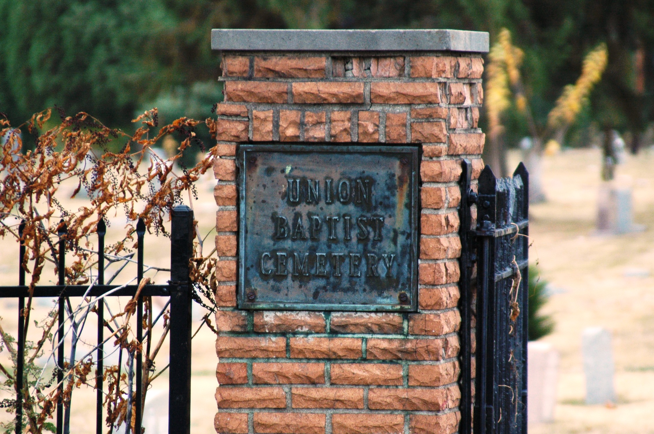 | The main entrance to the cemetery as seen from across Cleve Warsaw Road. | Left brick pillar with UNION BAPTIST CEMETERY inscribed on metallic plaque. |