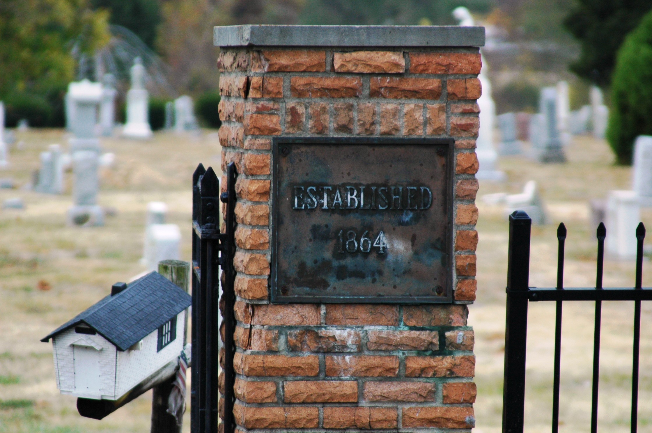 | Right brick pillar with ESTABLISHED 1864 inscribed on metallic plaque. |